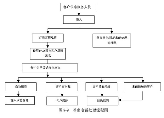 呼叫中心常規(guī)呼出服務(wù)的業(yè)務(wù)應(yīng)用主要包括:電話預(yù)約、建立數(shù)據(jù)庫、尋找目標(biāo)客戶、推廣、市場調(diào)查、客戶回訪、客戶關(guān)系管理、賬單催繳等。具體的應(yīng)用流程如圖所示。