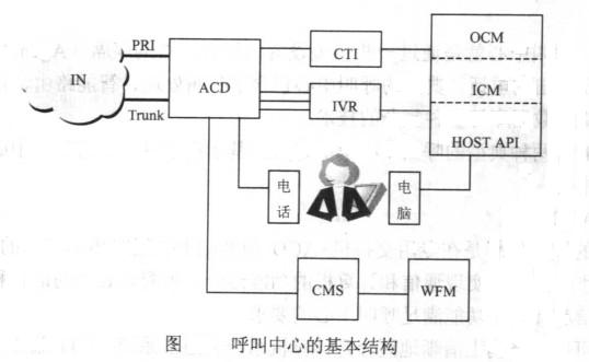 建設一個成功的呼叫中心系統,應該將大部分注意力集中在業務系統的構造上。強調呼叫中心系統真正的價值觀:以業務體系為基礎,以維護客戶關系為目的。一般說來,一個典型的呼叫中心由以下幾個部分組成,如圖所示