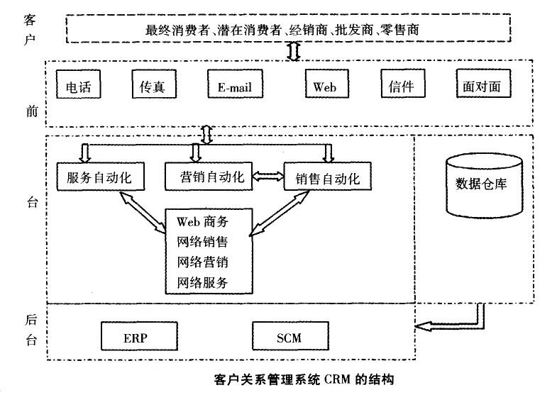 一套完整的CRM系統應能實現營銷、銷售、服務等業務的自動化,實現客戶數據共享,達到提高客戶滿意度、降低成本、增加收人、開拓市場、幫助企業高層進行生產、營銷等決策的目的。因此,CRM系統的主要組成部分應包括:客戶互動渠道管理、營銷自動化管理、銷售自動化管理、服務自動化管理、Web商務、商務智能。如圖所示。