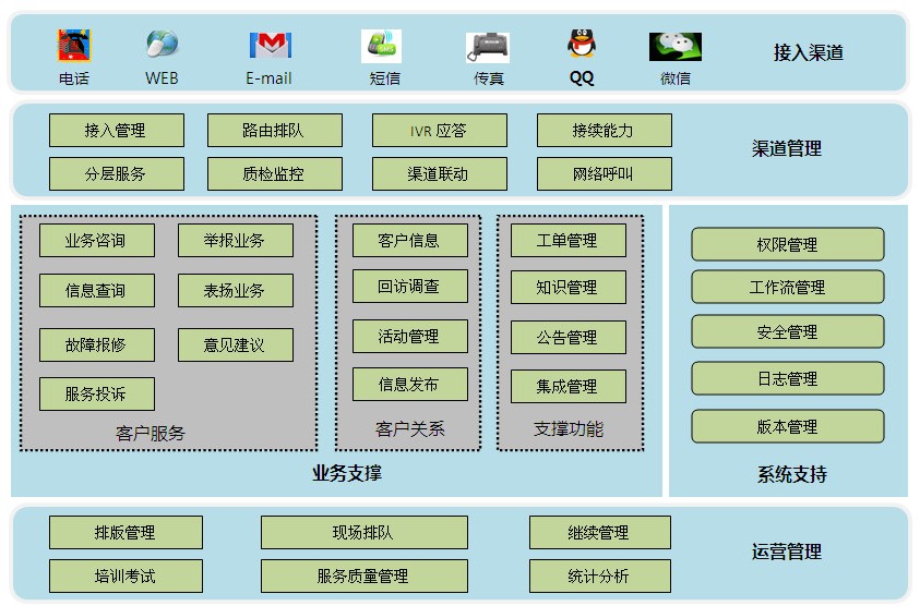 系統支撐負責提供多媒體呼叫中心正常運行所需的基本管理功能,包括:操作權限管理、工作流管理、安全管理、操作日志管理、軟件版本控制及系統接口管理。