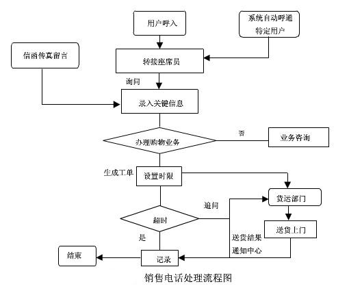 銷售電話適用于電視購物、倉儲(chǔ)式會(huì)員超市等。是一種新興的銷售形式如圖所示。它的特點(diǎn)是目標(biāo)指向明確,需要涉及企業(yè)的倉儲(chǔ)、貨運(yùn)、支付等系統(tǒng)。是一個(gè)典型的電子商務(wù)流程,而在這樣一個(gè)流程中,呼叫中心無疑是信息流的入口和終端。